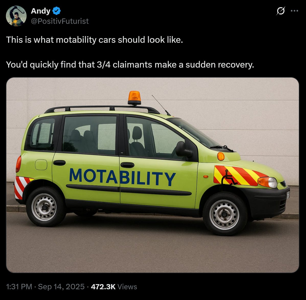 Motability (X), the ‘motability’ scheme was intended to fund appropriate vehicles for the disabled - however it has become subject to rampant fraud. Something like 20% (!!( of all new cars in the UK are purchased under the scheme. This is literally taxpayers buying new cars for welfare cheats. Unlike stringent and hard to enforce eligibility criteria I think this solution would be cheap, easy and very effective.